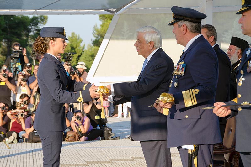 Ο πρόεδρος της Δημοκρατίας, Προκόπης Παυλόπουλος, απένειμε τα ξίφη στους νέους ανθυποσμηναγούς παρουσία του Υπουργού Εθνικής Άμυνας, κ. Πάνου Καμμένου, του Αρχηγού του Γενικού Επιτελείου Εθνικής Άμυνας (ΓΕΕΘΑ), Ναύαρχου Ευάγγελου Αποστολάκη ΠΝ και του Αρχηγού του Γενικού Επιτελείου Αεροπορίας (ΓΕΑ), Αντιπτέραρχου (Ι) Χρήστου Βαΐτση καθώς και του αναπληρωτή Υπουργού Εθνικής Άμυνας, κ. Δημήτρης Βίτσα.