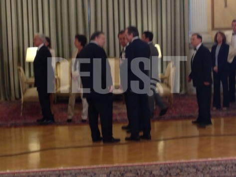 Εκ δεξιών του πρωθυπουργού κάθισε ο Ευάγγελος Βενιζέλος στο πρώτο υπουργικό συμβούλιο της νεας κυβέρνησης. Αφού οι υπουργοί πήραν τις θέσεις τους για αρκετή ώρα οι φωτογράφοι απαθανάτιζαν την στιγμή που ΝΔ και ΠΑΣΟΚ γέμιζαν από κοινού τα υπουργικά έδρανα.