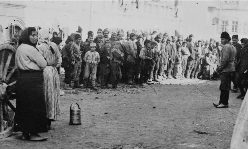 Η φωτογραφία δεν έχει ημερομηνία, έχει τίτλο “Έλληνες πρόφυγες στο Χαλέπι”, και δείχνει μια ομάδα ανθρώπων σε κουρέλιασμένα ρούχα, ανάμεσα τους μικρά αγόρια, που περιμένουν να φάνε. Σε πρώτο πλάνο, μια γυναίκα, με ένα τενεκεδάκι στα πόδια της, στέκεται δίπλα ένα πρότυπο “μαγειρίο”. Κάτω από τη φωτογραφία ως λεζάντα γράφει: “Δόθηκε φαγητό σε 12.000 Έλληνες από τους Αμερικανούς”. Συμφωνα με τα στοιχεία για την επιβεβλημένη ανταλλαγή πληθυσμών μεταξύ Ελλάδας και Τουρκίας, όπως συμφωνήθηκε με τη συνθήκη της Λωζάνης το 1923, 17.000 Έλληνες πρόσφυγες από την Μικρά Ασία μεταφέρθηκαν σε διάφορες πόλεις της Συρίας. Τόσο σοβαρή ήταν η κατάσταση που τον Αύγουστο του 1923 ο υπεύθυνος των Ελλήνων προσφύγων στο Χαλέπι έστειλε τηλεγράφημα στο υπουργείο εξωτερικών της Αθήνας, ζητώντας να αποτρέψει άλλους Έλληνες να φτάσουν στην πόλη, γιατί “έγινε αδύνατο να δεχτούν άλλους πρόσφυγες” Η γενικότερη κατάσταση για τους Έλληνες πρόσφυγες το καλοκαίρι του 1923 περιγράφεται ως “τραγική και αβέβαιη”.