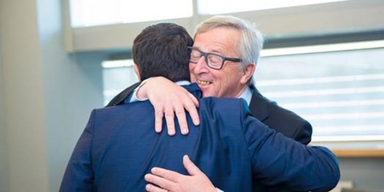 Ο “χαριτωμένος” Ζαν Κλοντ Γιούνκερ έχει πάντα κάτι να προσφέρει στους φωτογράφους στις συναντήσεις που έχει με Έλληνες πολιτικούς. Το Βαγγέλη Βενιζέλο δήθεν …φιλικά και πάντα …χαριτωμένα τον είχε “χτυπήσει” στο κεφάλι μ΄ ένα φάκελο όπως κάνουν οι δάσκαλοι στους… “μπουμπούνες” μαθητές. Τον Τσίπρα τον …σφιχταγκάλιασε …πατρικά και μετά τον έπιασε από το …χεράκι .