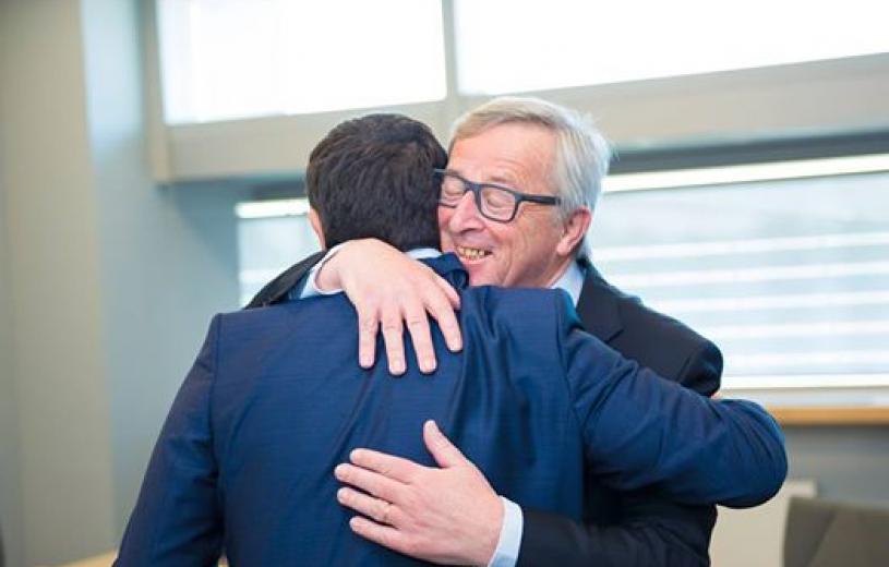 Ο “χαριτωμένος” Ζαν Κλοντ Γιούνκερ έχει πάντα κάτι να προσφέρει στους φωτογράφους στις συναντήσεις που έχει με Έλληνες πολιτικούς. Το Βαγγέλη Βενιζέλο δήθεν …φιλικά και πάντα …χαριτωμένα τον είχε “χτυπήσει” στο κεφάλι μ΄ ένα φάκελο όπως κάνουν οι δάσκαλοι στους… “μπουμπούνες” μαθητές. Τον Τσίπρα τον …σφιχταγκάλιασε …πατρικά και μετά τον έπιασε από το …χεράκι .