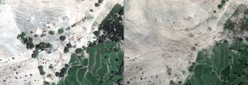 Οι δορυφορικές εικόνες υψηλής ανάλυσης που συλλέγονται πριν και μετά τον βομβαρδισμό παρέχουν άμεση εικόνα. Οι εικόνες πριν από τον βομβαρδισμό έχουν ημερομηνία 3 Σεπτεμβρίου 2016, 7 μήνες πριν από τον βομβαρδισμό. Οι απεικονίσεις μετά όπως φαίνεται παρακάτω, χρονολογούνται στις 14 Απριλίου 2017, την επομένη του βομβαρδισμού. Το κόκκινο πλαίσιο στην εικόνα παρακάτω είναι 1,5 x 1,5 χλμ. Και ο λευκός σταυρός μέσα στην Περιοχή 1 αντιπροσωπεύει το εκτιμώμενο σημείο πρόσκρουσης, με βάση τα αεροφωτογραφικά στοιχεία του βομβαρδισμού [iii].