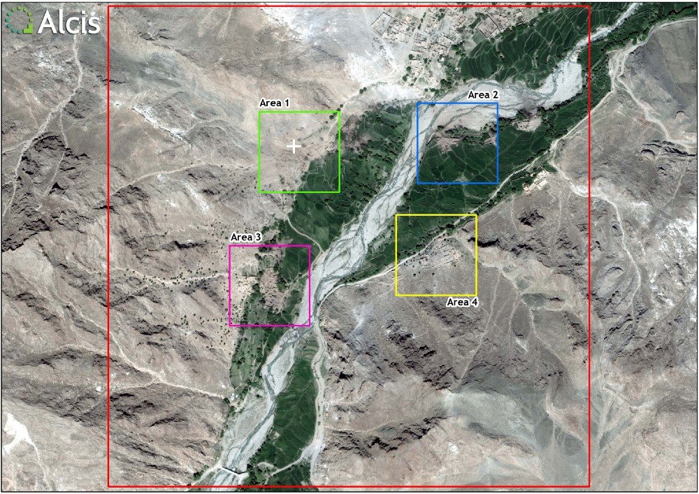 Τα χωριά στην περιοχή βρίσκονται στην είσοδο της κοιλάδας Mahmand, στην περιοχή Achin στο Nangarhar του Αφγανιστάν. Υπάρχουν ενδείξεις καταστροφής στη γεωργία και στα δέντρα στην περιοχή κοντά στην έκρηξη.