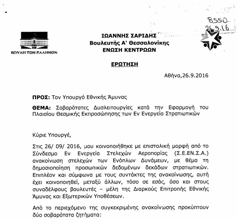 Η ερώτηση του βουλευτή βασίζεται σε ανακοίνωση του Συνδέσμου Εν Ενεργεία Στελεχών Αεροπορίας, σχετικά με τη δημοσιοποίηση προσωπικών δεδομένων δεκάδων στρατιωτικών στο διαδίκτυο.