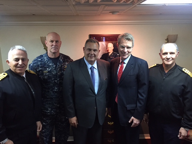 Ο Υπουργός Εθνικής Άμυνας Πάνος Καμμένος, συνοδευόμενος από τον Αρχηγό ΓΕΕΘΑ Ναύαρχο Ευάγγελο Αποστολάκη ΠΝ και τον Αρχηγό ΓΕΝ Αντιναύαρχο Γεώργιο Γιακουμάκη ΠΝ, επισκέφθηκε το αεροπλανοφόρο «USS Dwight D. Eisenhower», το οποίο συμμετέχει σε ναυτικές επιχειρήσεις στην Ανατολική Μεσόγειο.