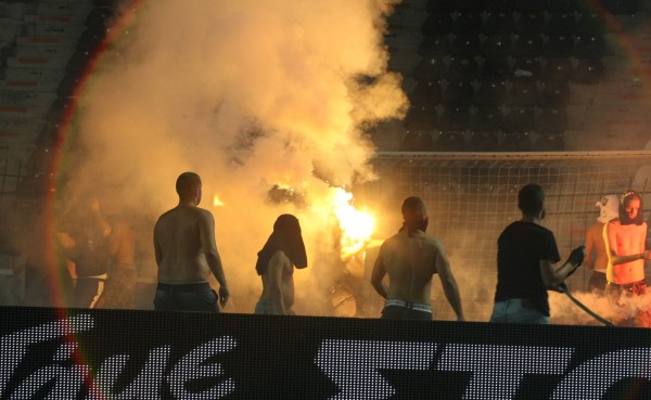 Το κακό είχε ξεκινήσει από νωρίς όταν κατά την άφιξη των οπαδών της Ραπίντ οπαδοί του ΠΑΟΚ πέταξαν αντικείμενα και η αστυνομία έκανε χρήση δακρυγόνων.