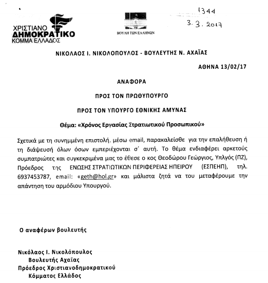 Αναφορά προς τον πρωθυπουργό το θέμα σχετικά με τον χρόνο εργασίας στρατιωτικού προσωπικού απο τον βουλευτή Αχαϊας και πρόεδρο του Χριστιανοδημοκρατικού κόμματος Ελλάδος Νικόλαο Νικολόπουλου.