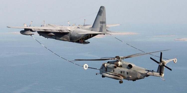 Απίστευτος ανεφοδιασμός εν ώρα πτήσης! Ένα αμερικανικό ελικόπτερο Sikorsky CH-53 Super Stallion των Πεζοναυτών προσεγγίζει ένα αμερικανικό HC-130P μαχητικό της Πολεμικής Αεροπορίας για ανεφοδιασμό πάνω από το Τζιμπουτί κατά τη διάρκεια της επιχείρισης ‘’Enduring Freedom’’.