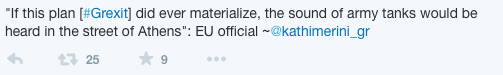 “Αν αυτό το σχέδιο -το Grexit- κάποια στιγμή υλοποιηθεί ,ο ήχος των αρμάτων μάχης θα ακουστεί στους δρόμους της Αθήνας”! Πρόκειται για εκτίμηση ευρωπαίου αξιωματούχου, η οποία κάνει τον γύρο των μέσων κοινωνικής δικτύωσης και του διαδικτύου! Οι “αξιωματούχοι” , φαίνεται ότι συνεχίζουν να “παίζουν” με την Ελλάδα και τα νεύρα μας!