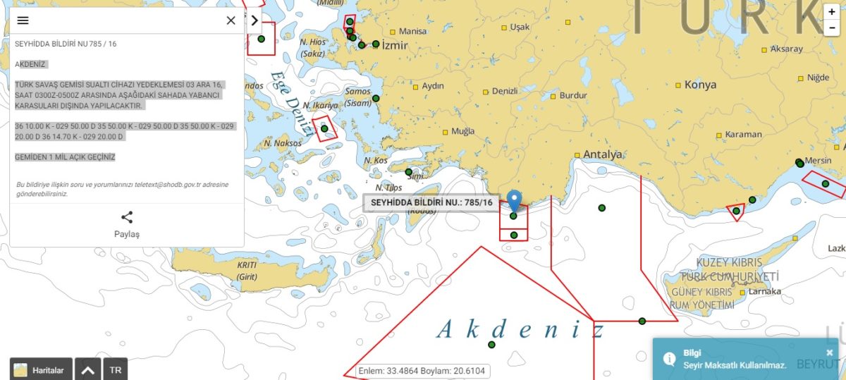 Σύμφωνα με την NAVTEX 785/16 που εξέδωσαν σήμερα στις 15:40 το μεσημέρι (τοπική ώρα), αύριο Σάββατο 3 Δεκεμβρίου δεσμεύουν περιοχή για άσκηση πολεμικού πλοίου με υποβρύχια συσκευή. Προφανώς θα αποτελεί σενάριο της ανθυποβρυχιακής άσκησης που έχουν σε εξέλιξη την περιοχή.
