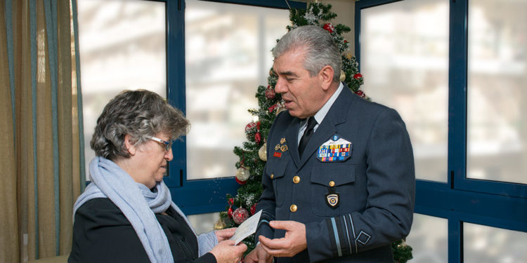 Είναι η στιγμή που η κ. Μαρία Τρυφωνίδου, πρόεδρος του συλλόγου Γονέων Παιδιών με Νεοπλασματική Ασθένεια «Φλόγα», παραλαμβάνει την επιταγή με το ποσό που συγκέντρωσε το προσωπικό της Πολεμικής Αεροπορίας ως δωρεά.