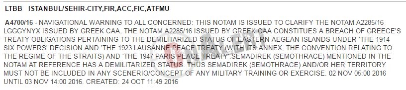Νωρίτερα η Τουρκία με την NOTAM A4700/16 (στις 11:49 π.μ) είχε σπεύσει να δηλώσει ότι η Ελλάδα με την ΝΟΤΑΜ Α2285/16 που ανήγγειλε (στις 21 Οκτωβρίου) τη διεξαγωγή ασκήσεων στην ευρύτερη περιοχή της Αλεξανδρούπολης για τις 2-3 Νοεμβρίου παραβιάζει τις υποχρεώσεις της από τις Συνθήκες, για το καθεστώς αποστρατιωτικοποίησης των νησιών του Ανατολικού Αιγαίου βάσει της απόφασης των «Έξι Δυνάμεων του 1914» και της Συνθήκης της Λωζάννης του 1923, με το προσάρτημα της Συνθήκης που σχετίζεται με το καθεστώς των Στενών, καθώς και με την Συνθήκη των Παρισίων του 1947.