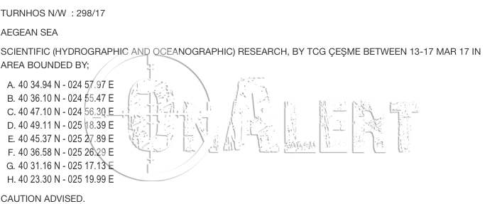 Όπως αναγράφεται στην NAVTEX 298/17 το Cesme θα πραγματοποιήσει υδρογραφικές και ωκεανογραφικές έρευνες απο τις 13 Μαρτίου εως τις 17 Μαρτίου στην θαλάσσια περιοχή των διεθνών υδάτων που εκτείνεται μεταξύ της Θάσου- Θράκης- Σαμοθράκης. Αξίζει να σημειώσουμε οτι με το CESME η Τουρκία θα έχει δύο σκάφη που θα διεξάγουν «έρευνες» στο Αιγαίο καθώς το ωκεανογραφικό σκάφος PIRI – REIS ( ΠΙΡΙ – ΡΕΙΣ ) βρίσκεται στο Αιγαίο και στη Μεσόγειο απο τις 8 Μαρτίου, Τετάρτη και θα παραμείνει μέχρι και τις 18 Μαρτίου.
