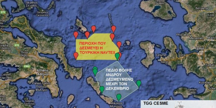 Η περιοχή που δέσμευσαν, αν και το τουρκικό γραφείο δεν εχει καμμία αναγνώριση απο τον IMO, εφάπτεται σχεδόν στο Πεδίο Βολής Άνδρου που δεσμεύει πάγια η χώρα μας και έχει αναγγείλει πυρά σε ολη τη διάρκεια του έτους.