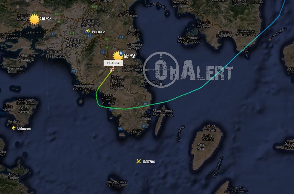 Κάτω σε κόκκινο κύκλο το αεροσκάφος του Βλαντιμίρ Πούτιν και λίγο βορειότερα το ελικόπτεο της αστυνοαμίας, ενώ πάνω από την Πέρδικα άλλο ένα αεροσκάφος για την ασφάλεια του Ρώσου προέδρου.